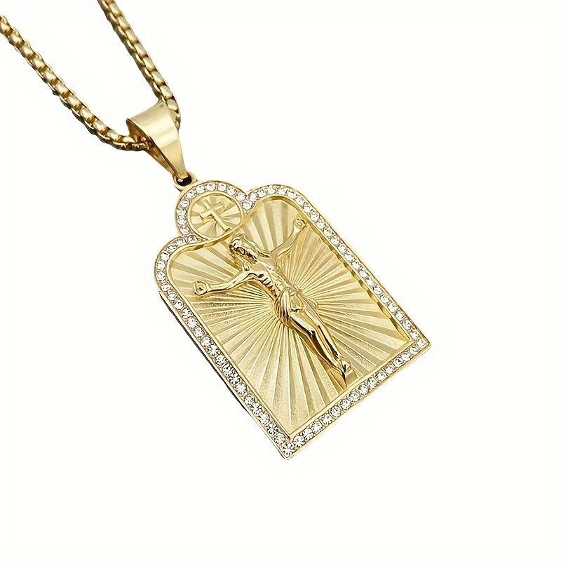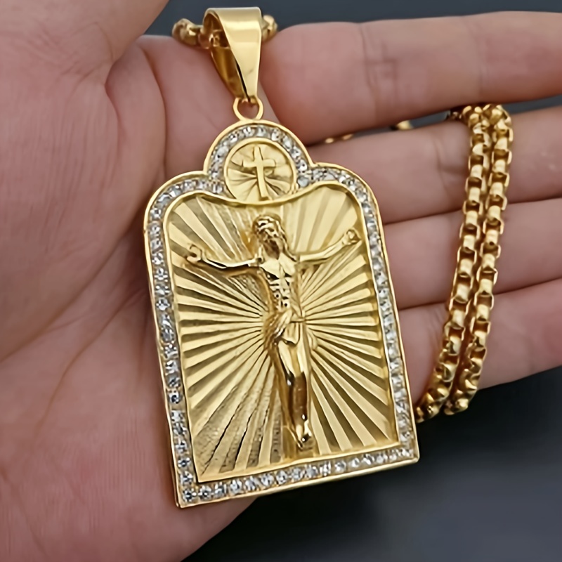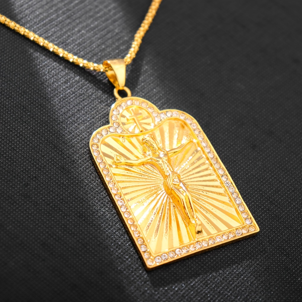 1pc Vintage Christian Jesus Cross Pendant Necklace - Golden-Tone Crucifix with R