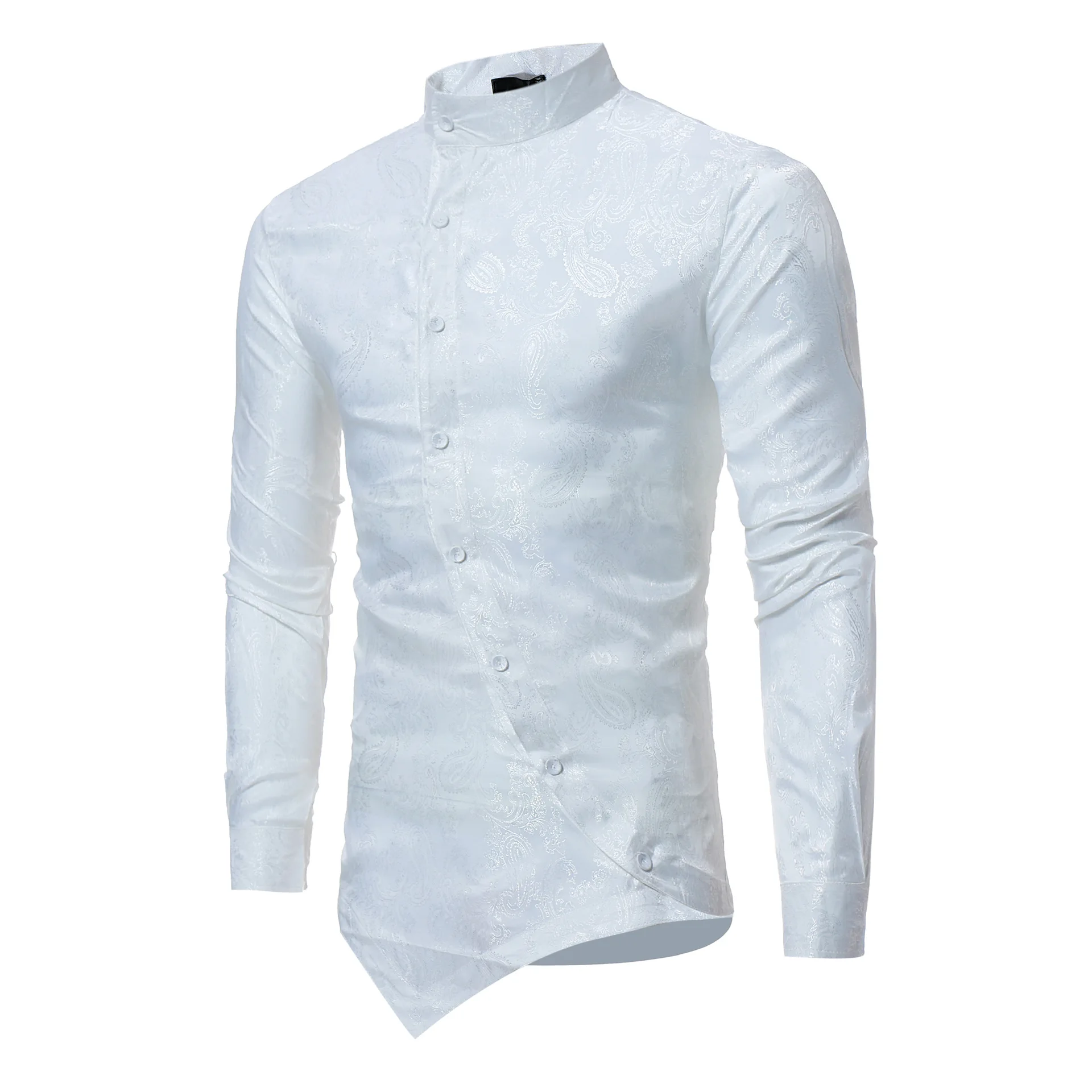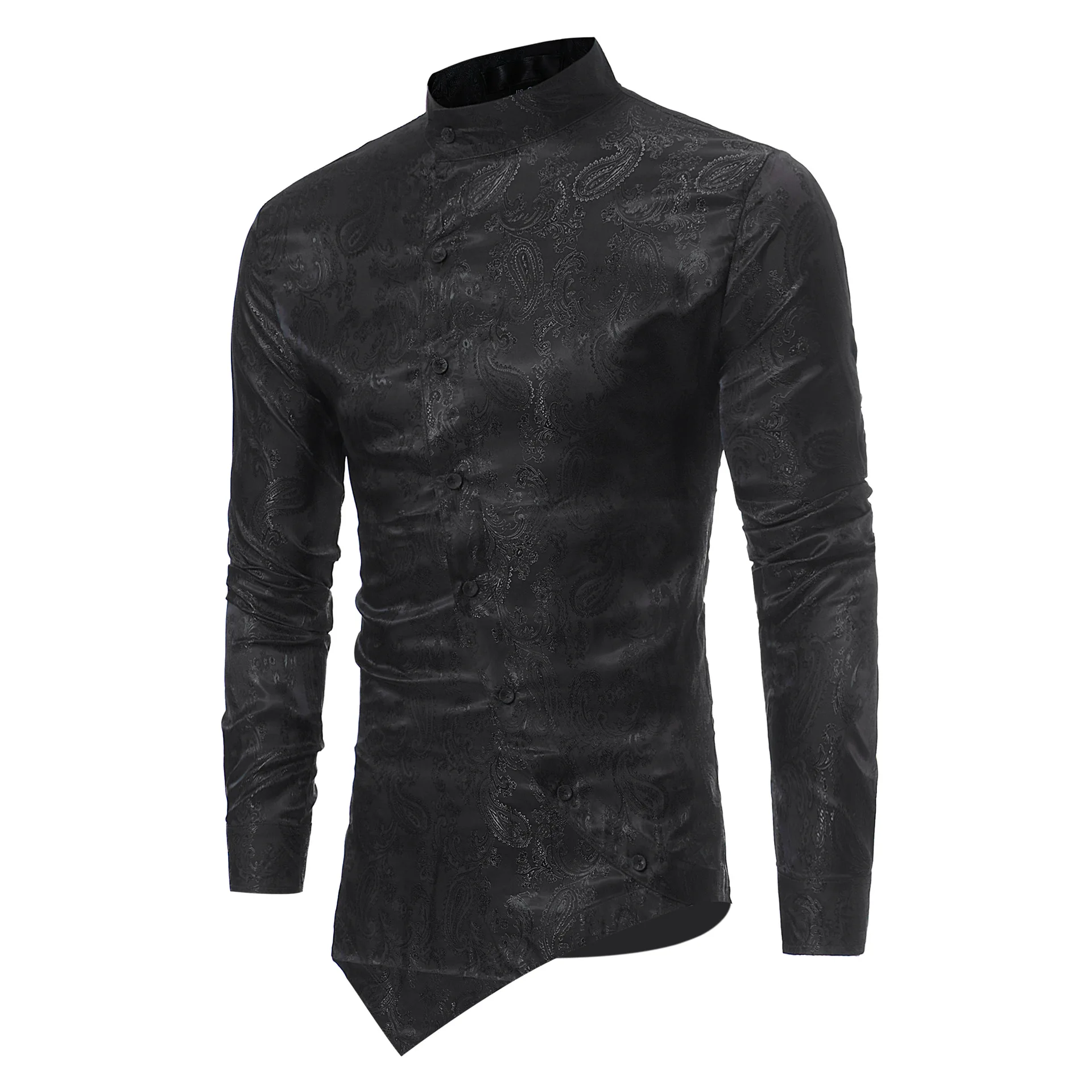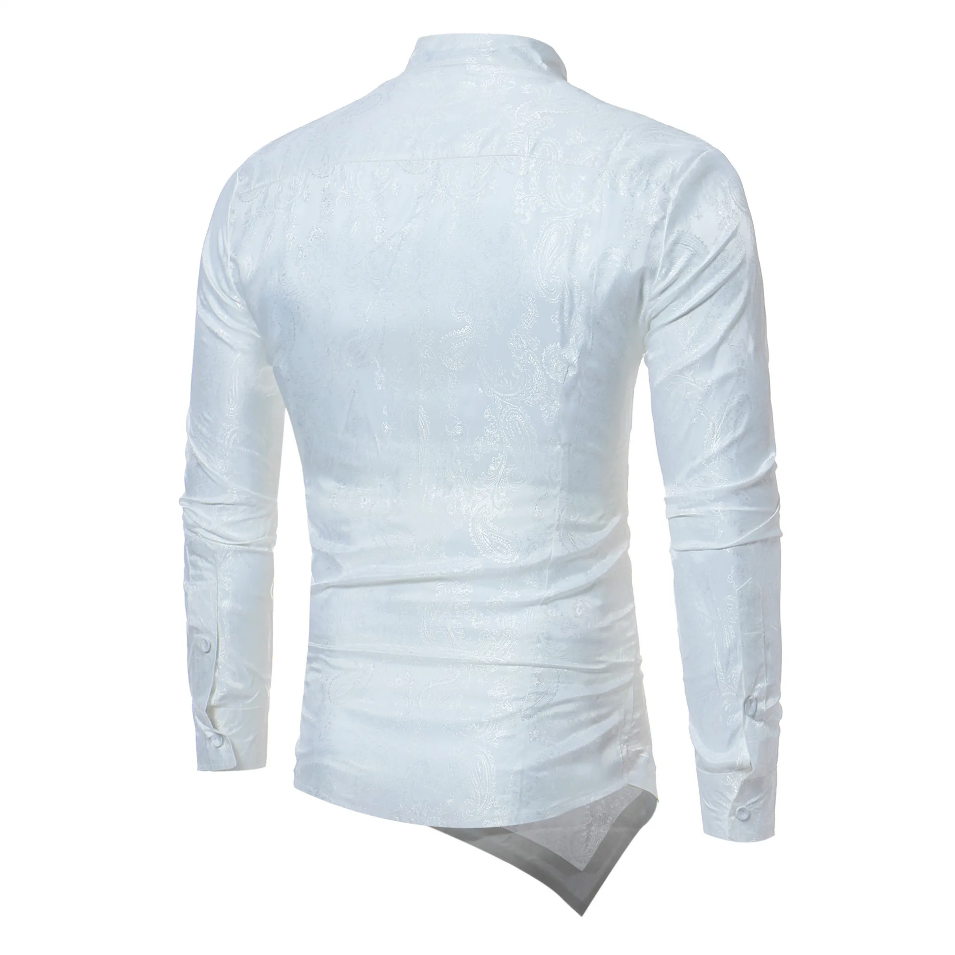 2025 Men's Irregular Oblique Hem Shirts Fashion Printed Stand Collar Button Long Sleeve Shirts Slim Casual Social Shirts for Men