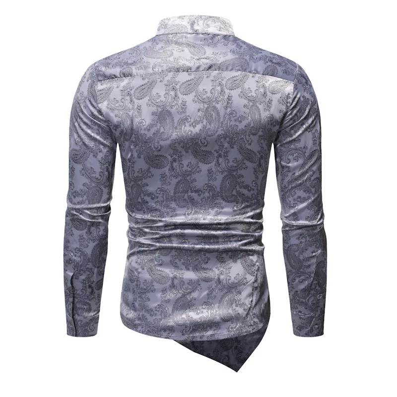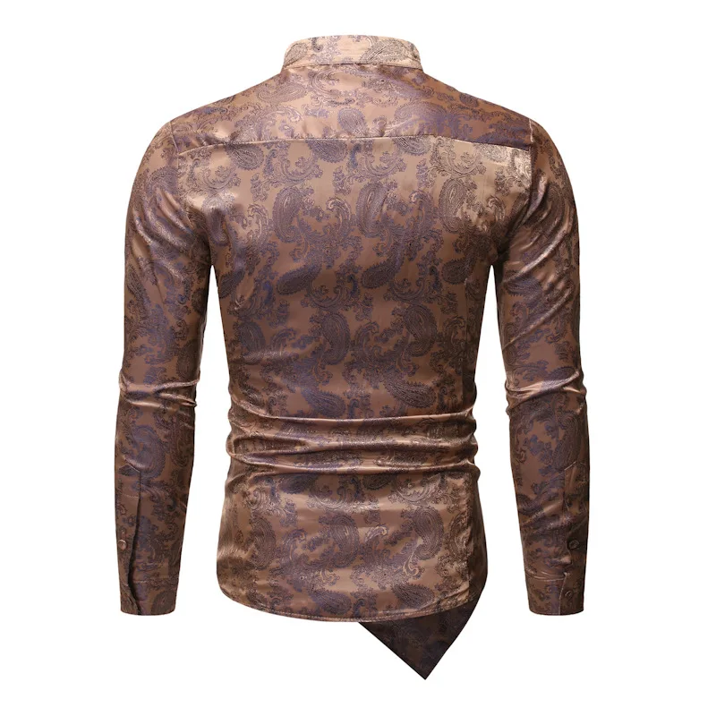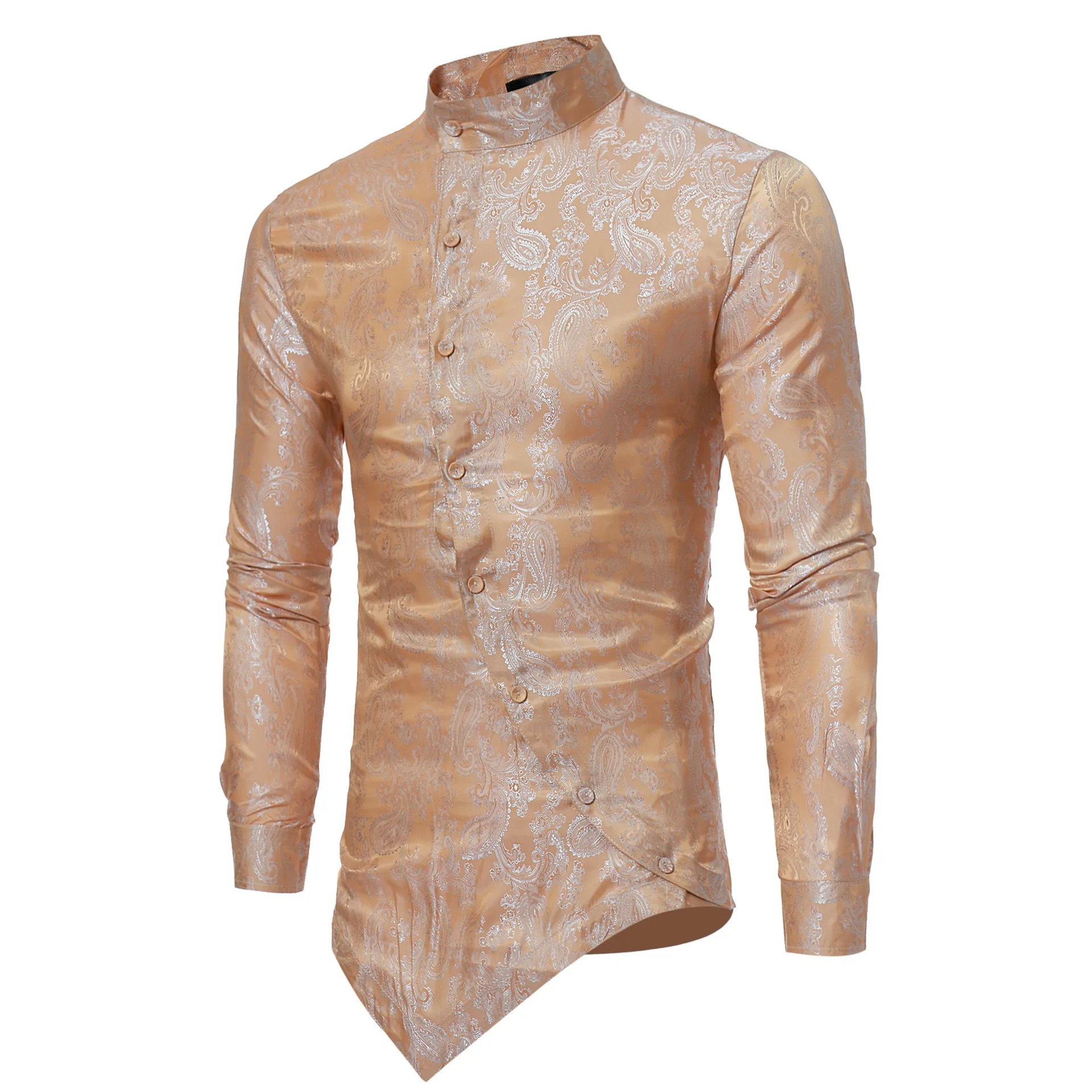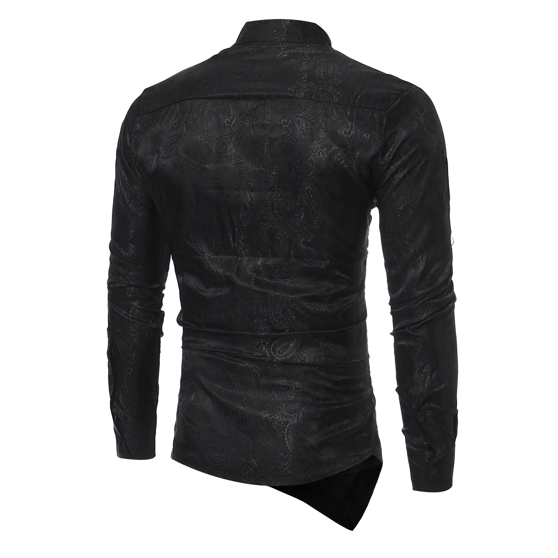 2025 Men's Irregular Oblique Hem Shirts Fashion Printed Stand Collar Button Long Sleeve Shirts Slim Casual Social Shirts for Men