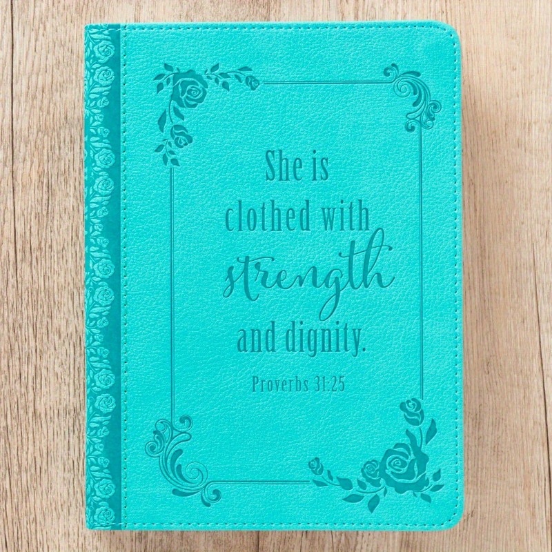 The Strength and Dignity Teal Faux Leather Handy-sized Journal is a pretty way to celebrate the godly women in your family or your circle of friends. Women whose words reflect figure are a family's greatest asset, so go ahead and honor the mentors in your family with this handy-sized journal that will express your admiration. The front cover of this travel-friendly teal faux leather journal is heat-debossed with an elegant heat-debossed frame with floral accents in each corner. The frame holds the heat-debossed sentiment in a multi-font design. She is clothed with strength and dignityProverbs 31:25 The back cover is decorated with a heat-debossed floral bouquet in the lower left-hand corner. The entire spine is decorated with a heat-debossed creeping rose design accented with topstitching. Additional topstitching around the edges of the journal adds strength and durability.