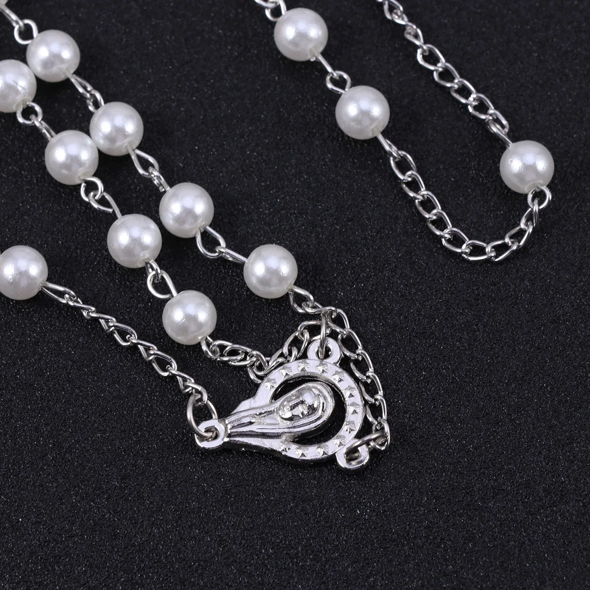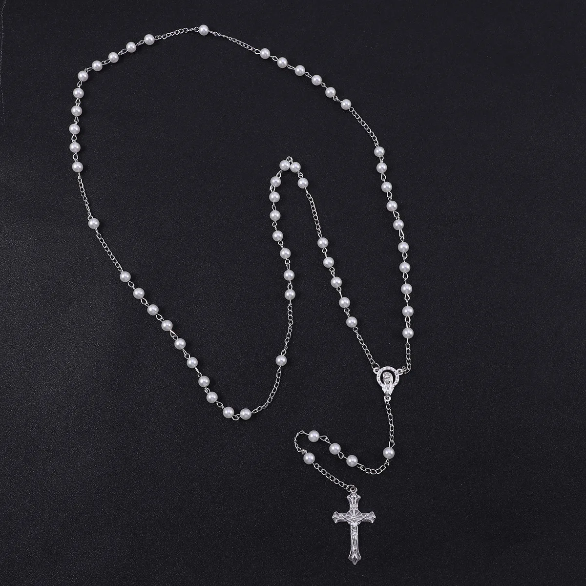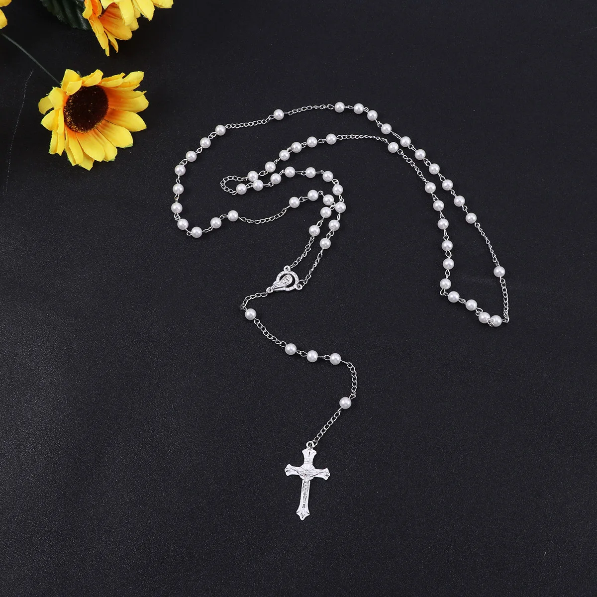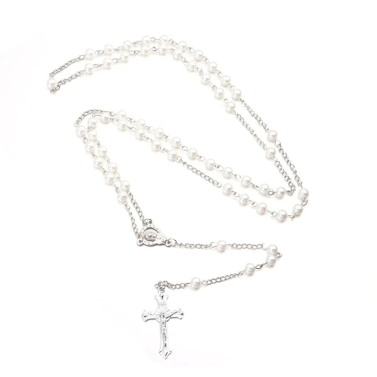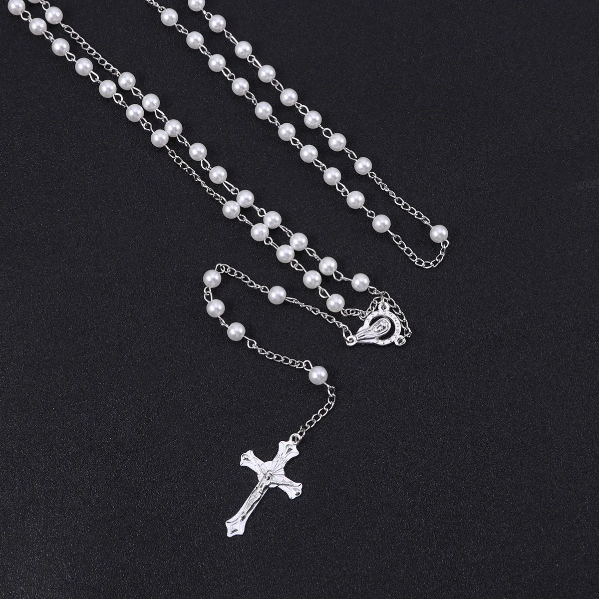 Beautiful Christian Pearl Beads Rosary Necklace White Crucifix Keepsake Prayer Beads Perfect Award for Excellent Work