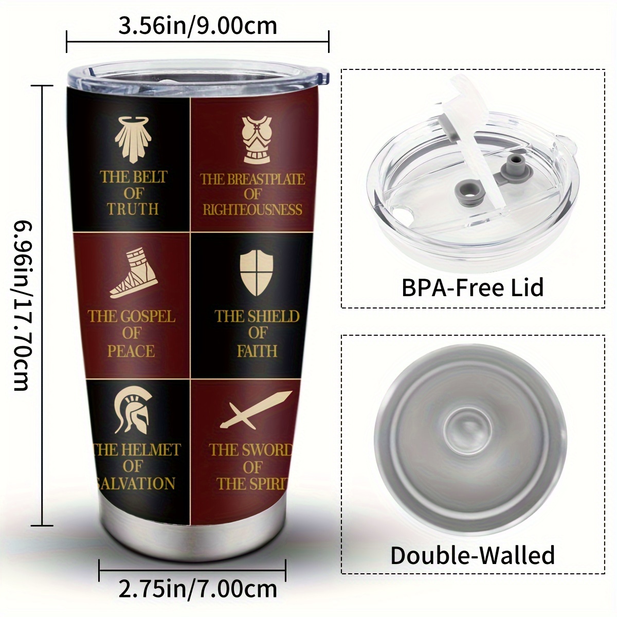SPECIFICATIONSHolidays: otherItem ID: WE137508Material: MetalPower Supply: Use Without ElectricityChristian Armor of God 20oz Stainless Steel Tumbler - Religious Inspirational GiSKU: 20640£12.59PriceStyle*AQuantity*Add to CartBuy Now