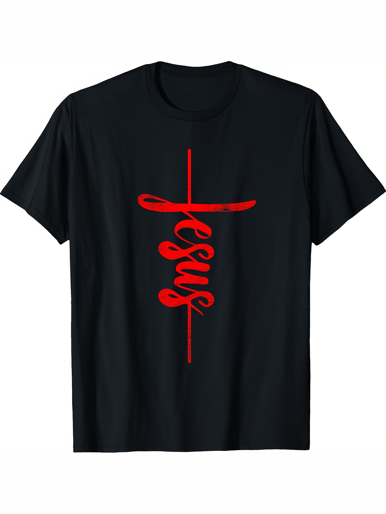 Men's Jesus Christian Cross Cursive Art T-Shirt - Black with Red Print, Short Sl