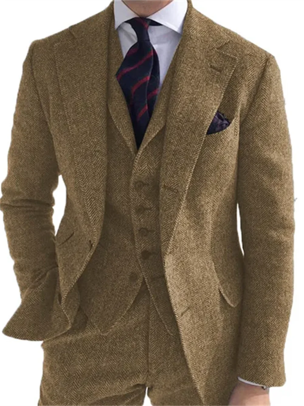 Men‘s Suits 3 Pieces Green Wool Tweed Herringbone Business Retro Classic Patte
