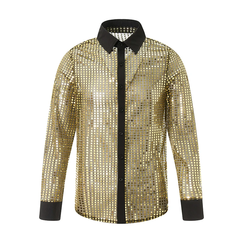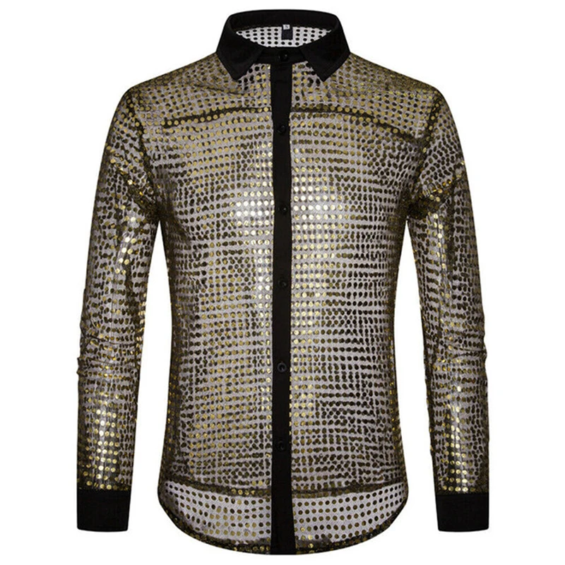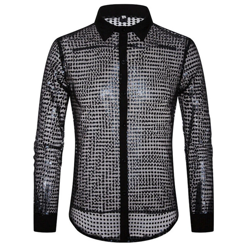 Mens Sheer Sequins Shirt Long Sleeve Turn Down Collar Button Dot Shirts Luxury D