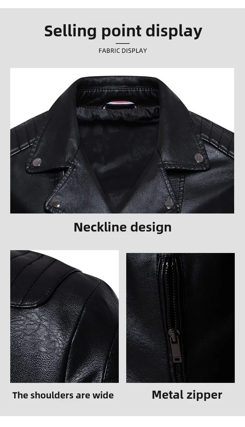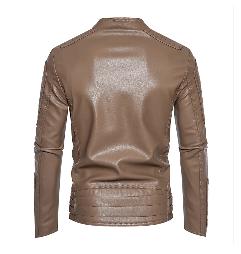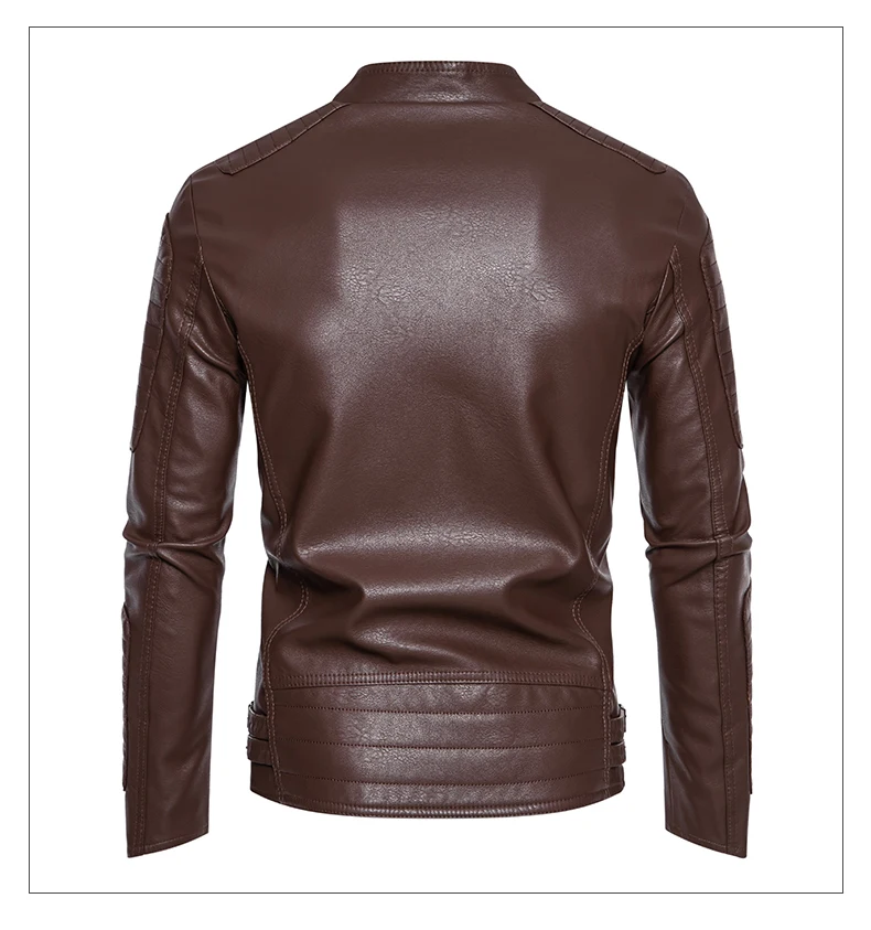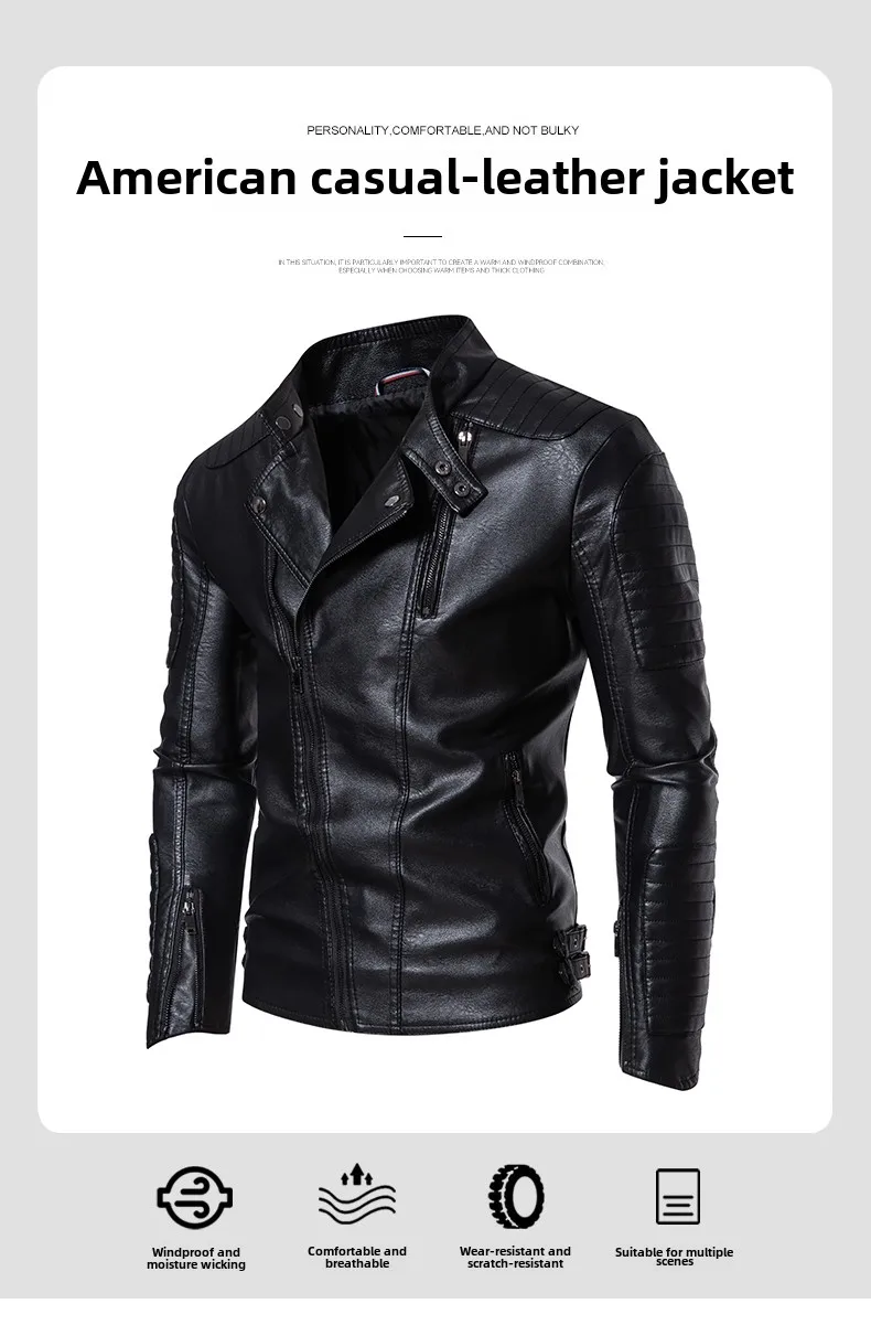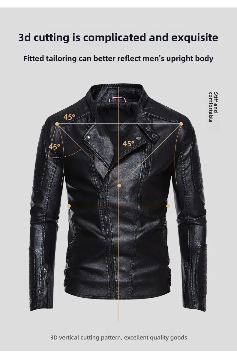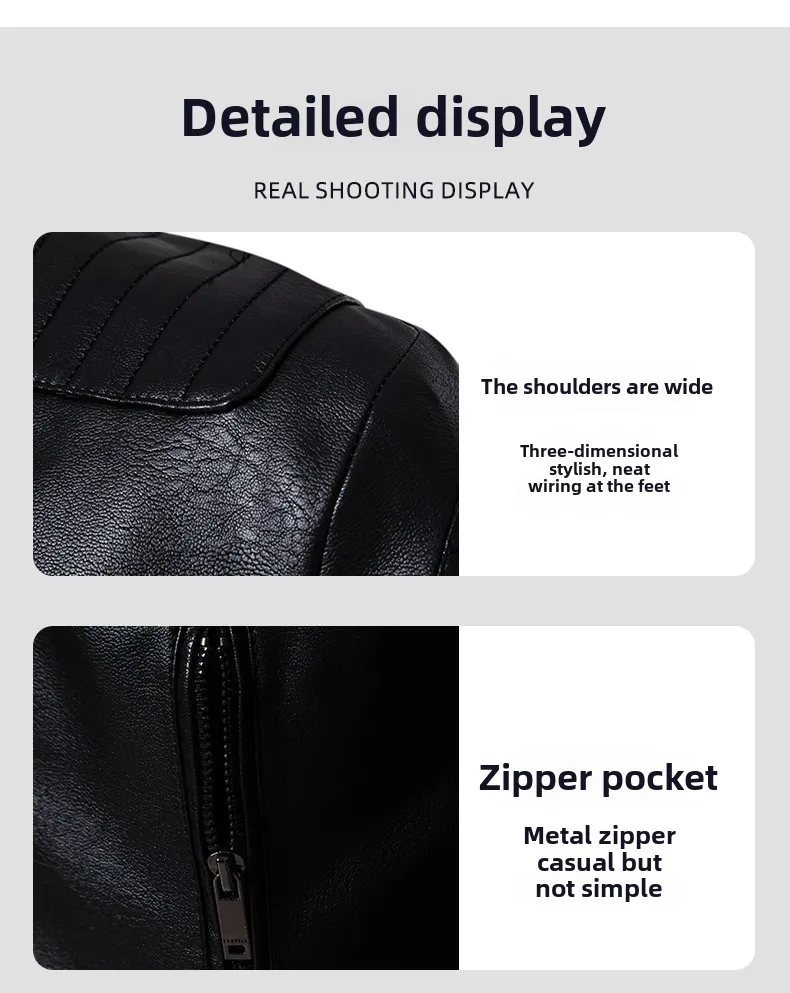 The sleek design of this leather jacket transitions effortlessly from casual outings to business settings, blending functionality with style.